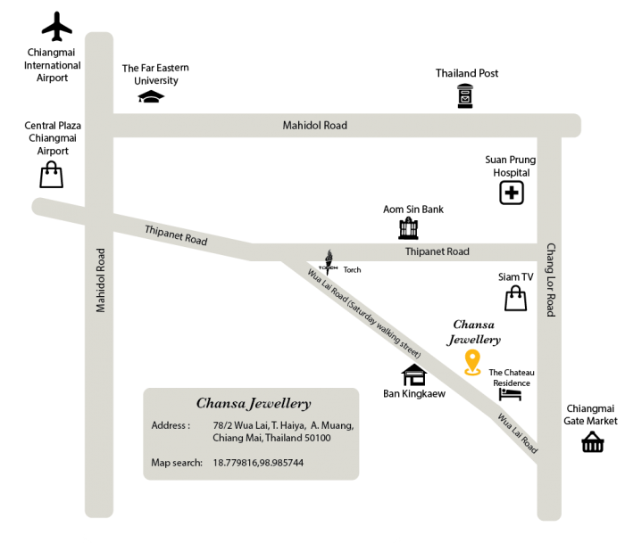 78/2 ถนน วัวลาย ต.หายยา อ.เมือง จ.เชียงใหม่ 50100 ///// เวลาทำการ : จันทร์ - ศุกร์ 10.00 - 18.00 น. / เสาร์: 10.00 - 21.00 น. หรือนัดหมายล่วงหน้าเพื่อเข้าชมนอกเวลาทำการปกติ