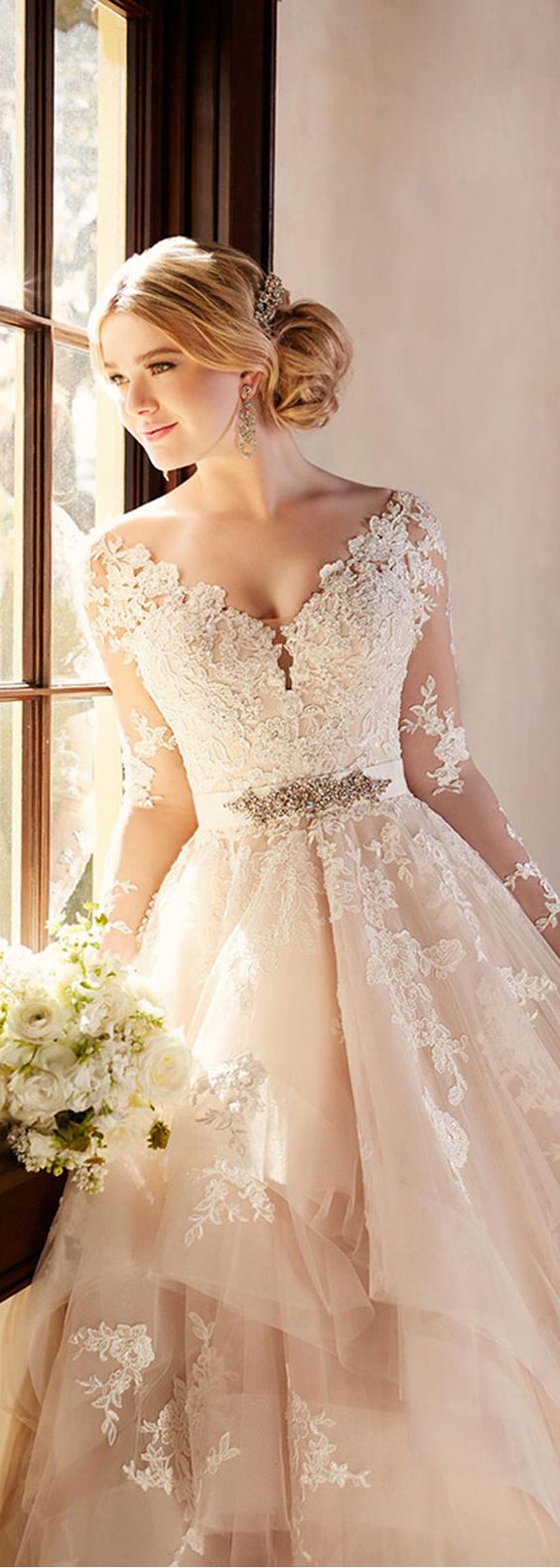 4. A LINE : ชุดแต่งงานทรงเอไลน์ มีลักษณะเป็นกระโปรงบานเล็กน้อย ไม่มีจีบรูดเอว ตัวกระโปรงจะค่อย ๆ บานออกเป็นรูปตัว A ตั้งแต่สะโพกลงไป ส่วนคอเสื้อด้านบนก็แล้วแต่ความชอบของเจ้าสาว ไม่ว่าจะเป็นเกาะอก สายเดี่ยว หรือคอตั้งก็ได้ ชุดทรงนี้เหมาะกับเจ้าสาวทุกรูปร่าง โดยเฉพาะอย่างยิ่งเจ้าสาวที่ค่อนข้างตัวเล็ก ไม่สูง เพราะใส่แล้วช่วยทำให้สวยสง่างามยิ่งขึ้น อีกทั้งยังช่วยอำพรางจุดด้อยที่เจ้าสาวอยากปกปิดได้เป็นอย่างดี ไม่ว่าจะเป็นต้นขาใหญ่ สะโพก หรือเอวที่หนา
