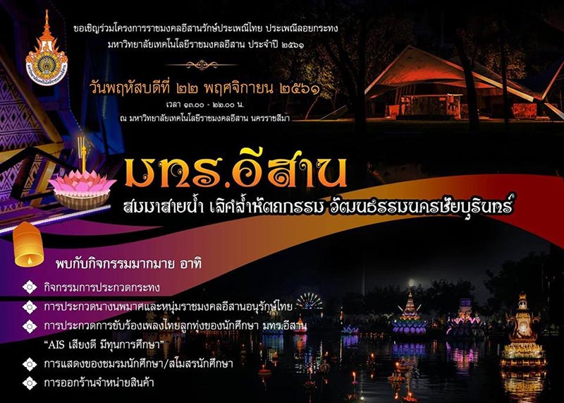 ขอเชิญเที่ยวงานประเพณีลอยกระทง มหาวิทยาลัยเทคโนโลยีราชมงคลอีสาน ประจำปี 2561