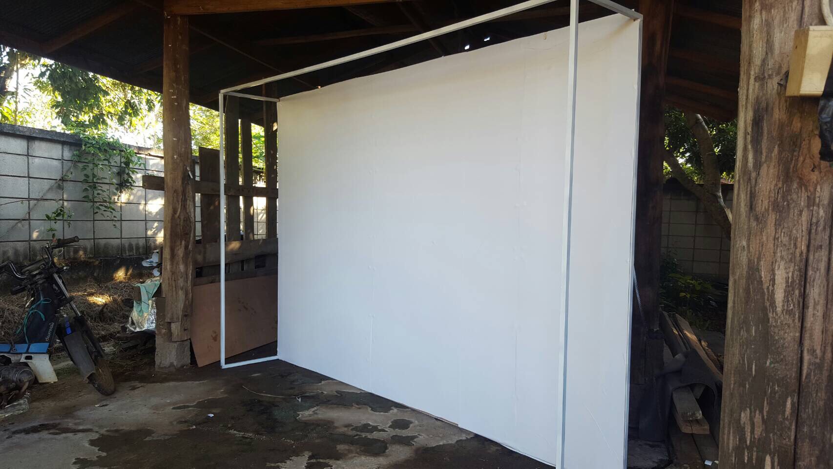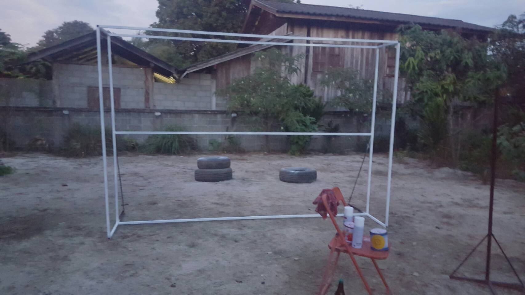 1. โครงเหล็ก ขนาด กว้าง 3 ม. สูง 2.5 ม. เราซื้อเหล็กมาแล้วจ้างช่างแถวบ้านเชื่อมให้ค่ะ (ใช้เสร็จทำราวตากผ้าต่อ) หลังจากนั้นขัดด้วยกระดาษทราย แล้วพ่นด้วยสีสเปรย์สีขาวค่ะ