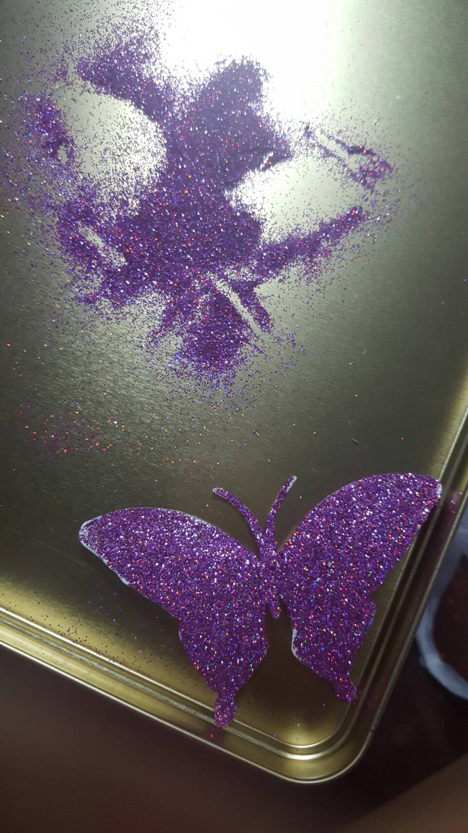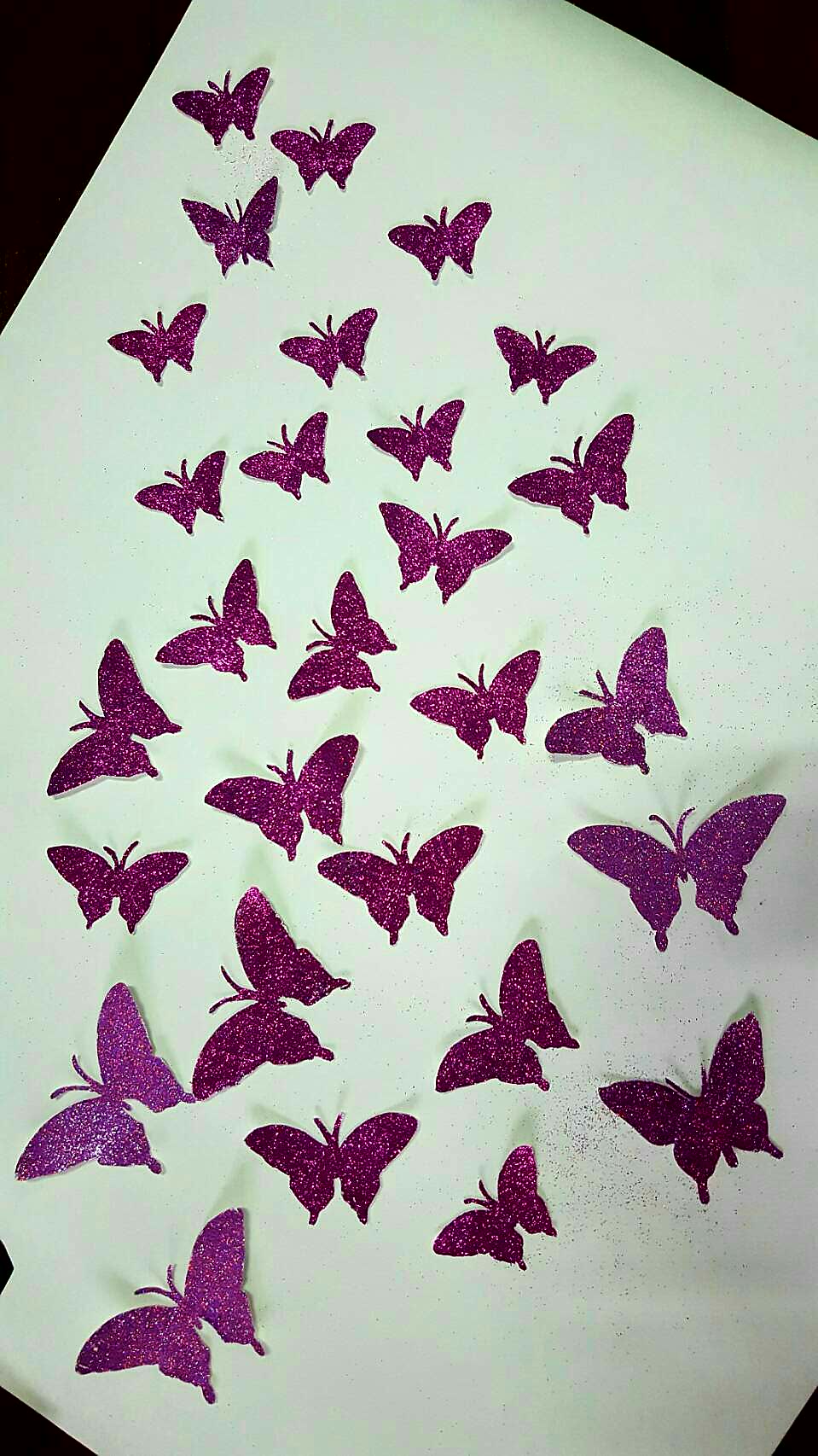 พอได้ผีเสื้อตามจำนวน ก็เอามาทากาวลาเท็กซ์ แล้วโรยด้วยกากเพชรค่ะ รอให้แห้ง ตอนทากาวให้เน้นตรงขอบๆหน่อยค่ะ เพราะกากเพชรมักไม่ติด แต่พอแห้งหมด เรามาเช็คอีกที อันไหนไม่ติด ก็ทาซ้ำค่ะ แค่นั้นก็สวยแล้ว