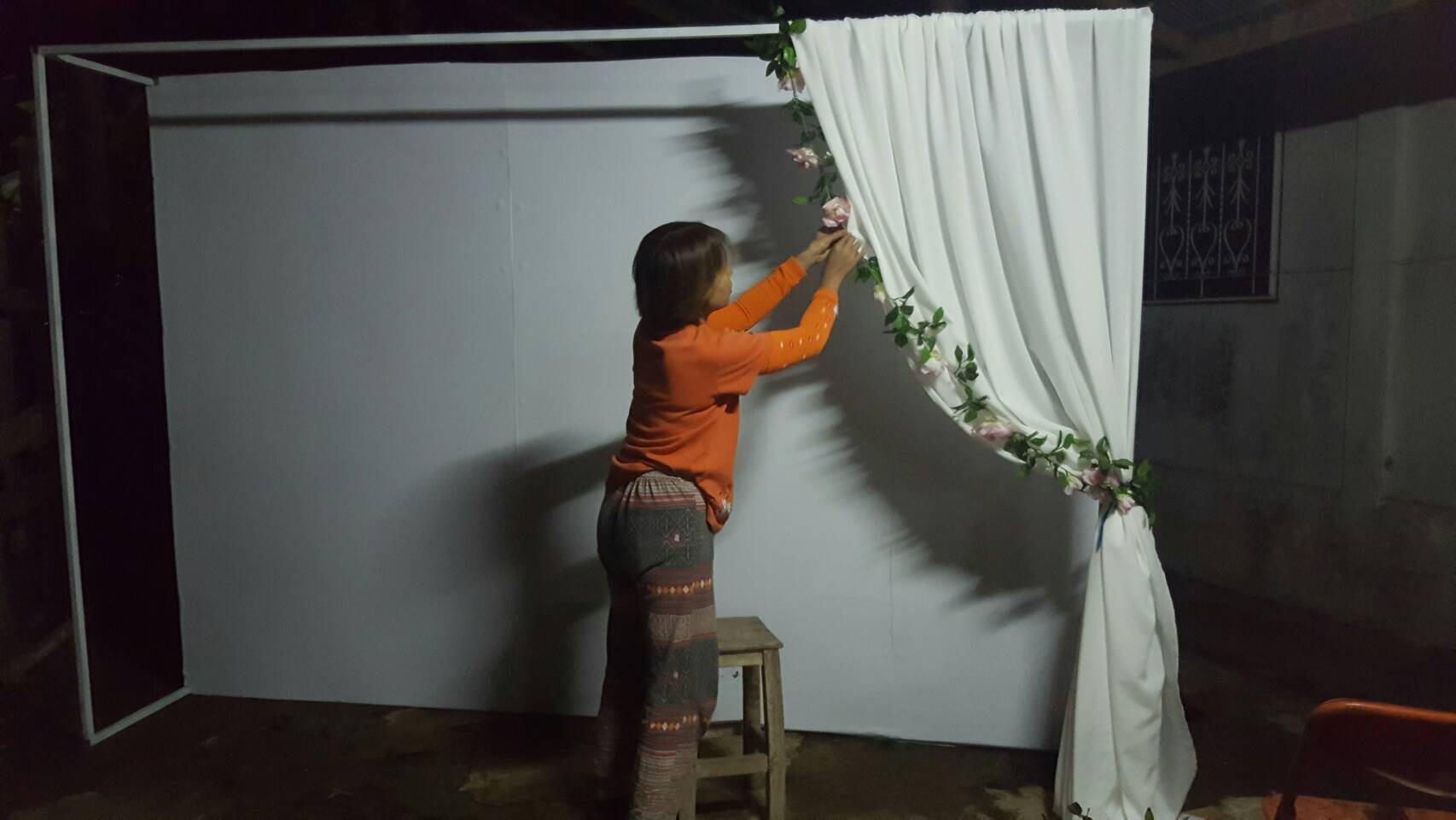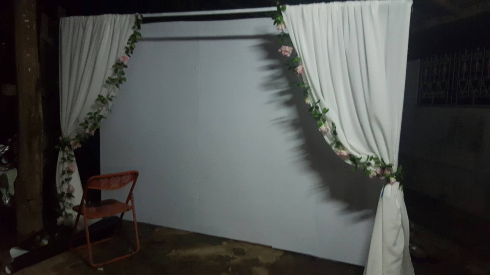 1. ผ้าชีฟองสีขาว ชมพู ผูกกับคานเต็นท์ค่ะ