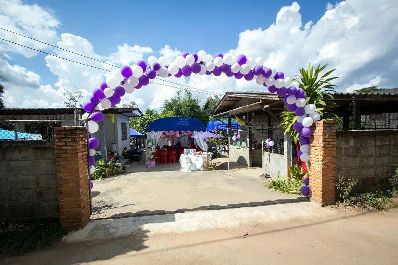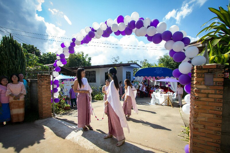 1. ซุ้มทางเข้างาน ตกแต่งด้วยลูกโป่ง ทำโครงโค้งด้วยไม้ไผ่ค่ะ งานนี้ ลุง ป้า น้า อา มาช่วยกันเป่าลูกโป่ง ทำเอาเข็ดกันเลยทีเดียว