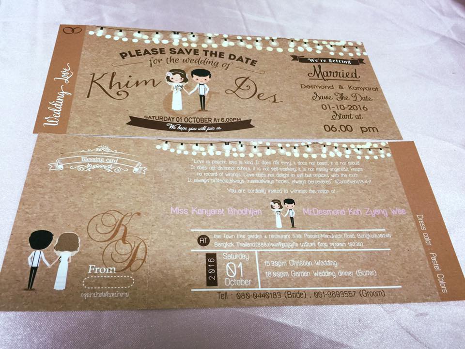 วันนี้ Weddinginlove นำมาฝากเป็นไอเดียคะ คู่รักคู่ไหนที่กำลังหาไอเดียทำการ์ดแต่งงาน ลองดูตัวอย่างที่นำมาฝากให้ชมกันค่ะ หรือ ลองปรึกษากับร้านที่รับทำการ์ดแต่งงาน โดยตรงได้เลยคะ อยากได้แบบไหน สไตล์ไหน ทางร้านการ์ดจัดให้ได้ตรงใจคุณแน่นอน! คะ