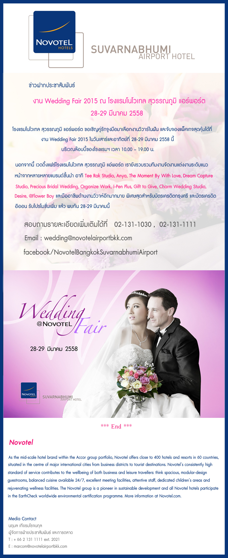 งาน Wedding Fair 2015 ณ โรงแรมโนโวเทล สุวรรณภูมิ แอร์พอร์ต 28-29 มีนาคม 2558