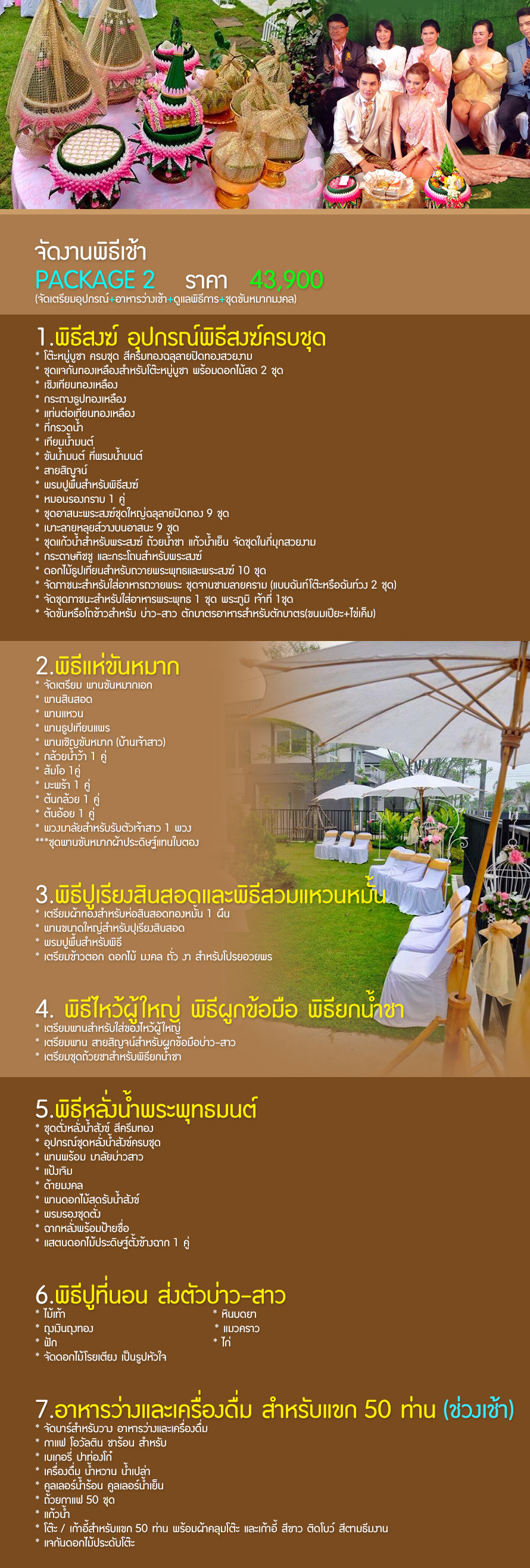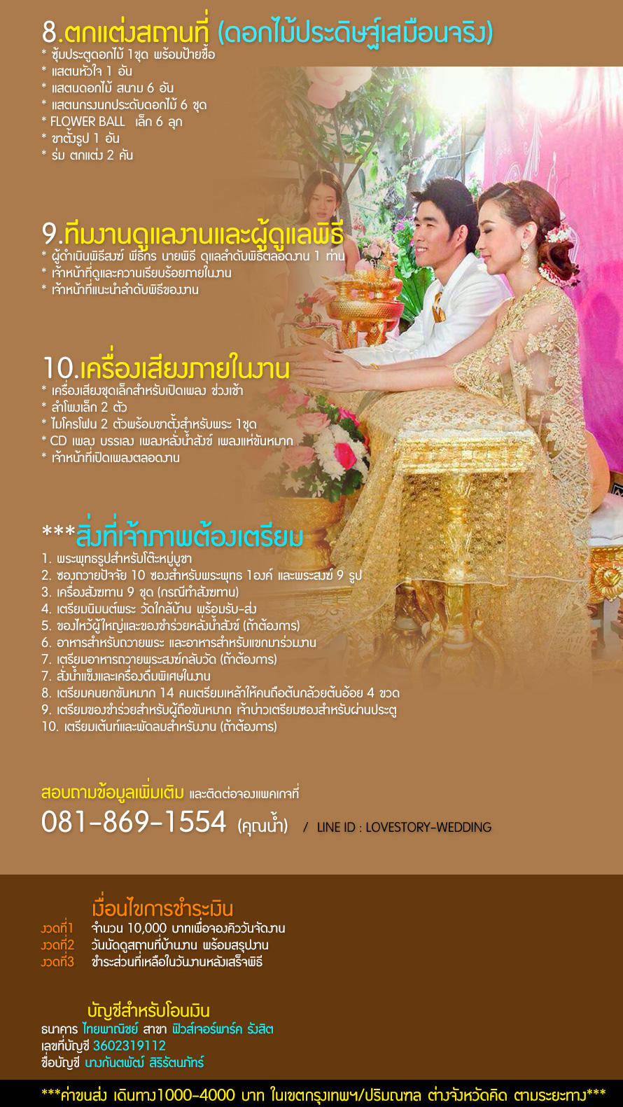 งานพิธีเช้า By Love Story Wedding ชั้น 3 ฟิวเจอร์พาร์ครังสิต โทร 02-958-0603 081-869-1554 รับจัดงานพิธีเช้า ดูแลงานแต่งงานช่วงเช้า งานพิธีหมั้น พิธียกน้ำชา พิธีสงฆ์ พิธีหลั่งน้ำสังข์ พิธีแห่ขันหมาก พิธีไหว้ผู้ใหญ่ พิธีส่งตัว Love Story wedding center รับจัดงานหมั้น งานแต่งงาน งานมงคลทุกชนิด รับจัดงานพิธีนอกสถานที่ " ดูแลวันสำคัญของคุณ เหมือนงานสำคัญของคนในครอบครัว " Love Story wedding center เปิดบริการ รับจัดงานหมั้น งานพิธีมงคลสมรส งานพิธีการช่วงเช้า ตามขนบธรรมเนียมประเพณี ในบรรยากาศสวยงาม และอบอุ่น ที่บ้านของคุณ พิธีแต่งงานเช้า ตามขนบธรรมเนียมประเพณี จัดขึ้นเพื่อเป็นสิริมงคล สำหรับการเริ่มต้นใช้ชีวิตคู่ที่สมบูรณ์แบบ ให้แก่คู่บ่าวสาว วันแต่งงานคือวันสำคัญวันหนึ่งของคุณ เพราะเรารู้ว่าวันนี้มีความหมายมากมายเพียงใด เราพร้อมให้คำปรึกษา เป็นผู้ช่วยและดูแลอย่างอบอุ่นในวันสำคัญของคุณ